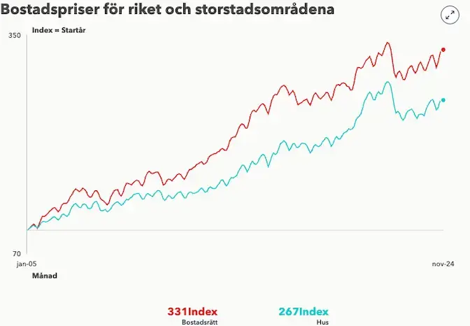 Bostadspriserna såg sin absoluta topp runt våren 2022 och har sedan dess fallit något över hela landet. På senare tid med sänkt styrränta och nu även med förslag om höjt bolånetak till 90 procent, har dock priserna börja vända uppåt igen.