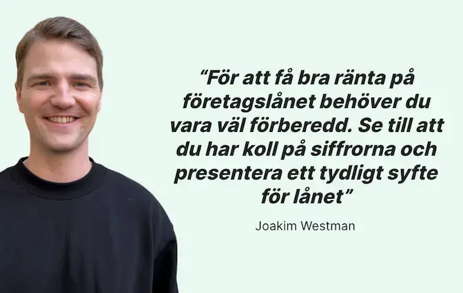 Om du vill pressa ner räntan för lånet kan det finnas möjlighet att gå i personlig borgen för lånet. Det är dock inget vi rekommenderar för större företagslån eftersom det ökar risken för dig som privatperson. - Titta efter andra alternativ