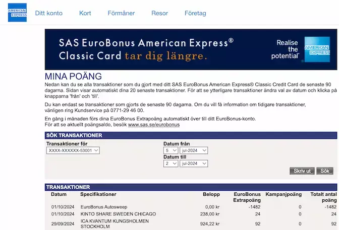 Du kan använda dig av sökfunktionen om det är en specifik transaktion du är intresserad av. Du ser även i kolumnerna till höger vad transaktionen kostat och hur mycket EuroBonuspoäng det genererat för dig.