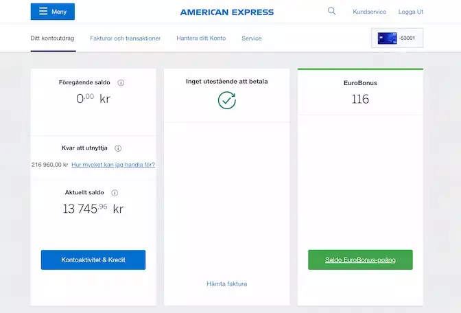 När du är inloggad hos American Express kan du se hur mycket du har i kredit att nyttja, vad ditt aktuella saldo är (utestående kredit), samt om du har något utestående saldo du ska betala just nu. Till höger i menyn kan du även se dina insamlade EuroBonuspoäng.