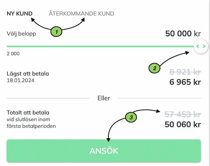 Som du kan se enligt bilden nedan blir det i steg 3 att man endast betalar en aviavgift på 60 kr/mån. Det totala att återbetala blir alltså ditt lånebelopp plus 60 kronor om du är ny kund.