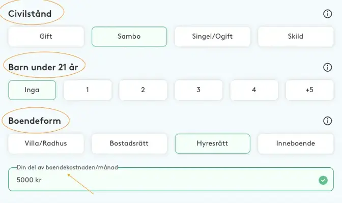 Här fyller du i civilstånd, alltså om du är sambo eller singel exempelvis. Dessutom fyller du i hur många barn du har samt dina boendekostnader.