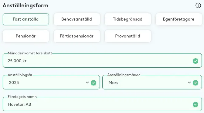 Du fyller i vilken typ av anställning du har samt din månadsinkomst.