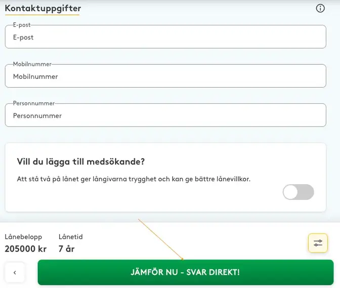 I det fjärde och sista steget behöver du bara fylla i dina kontaktuppgifter som personnummer, telefon och mail. Sedan är du redo att jämföra dina lånealterantiv!