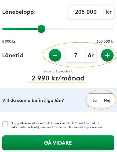 1. Fyll i lånebelopp, återbetalningstid och om du har tidigare lån du vill samla.