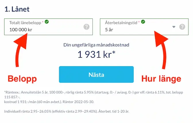 Justera reglagen för att se hur det påverkar din månads- och totalkostnad för lånet.