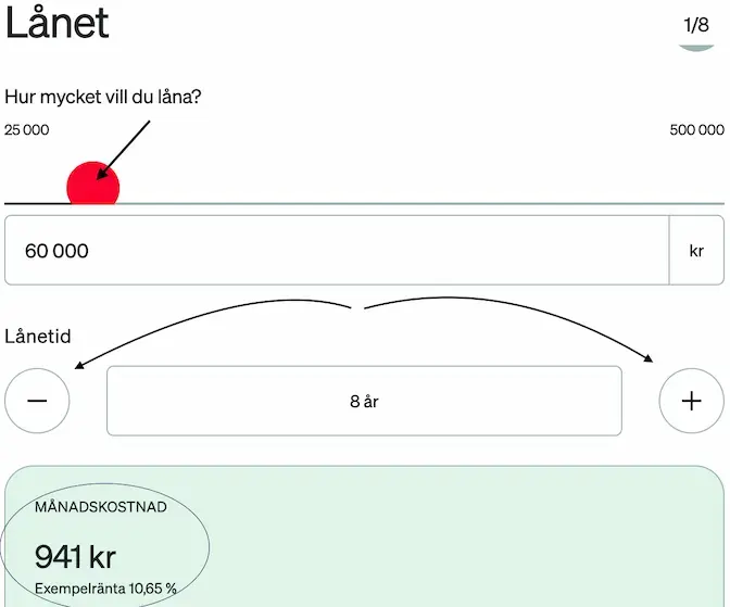 Sedan drar du i reglagen samt använder dig av plus och minus för att bestämma ditt lånebelopp och återbetalningstid. Du får då direkt en estimerad månadskostnad för lånet. Det är bra för att se om du klarar av att återbetala det.